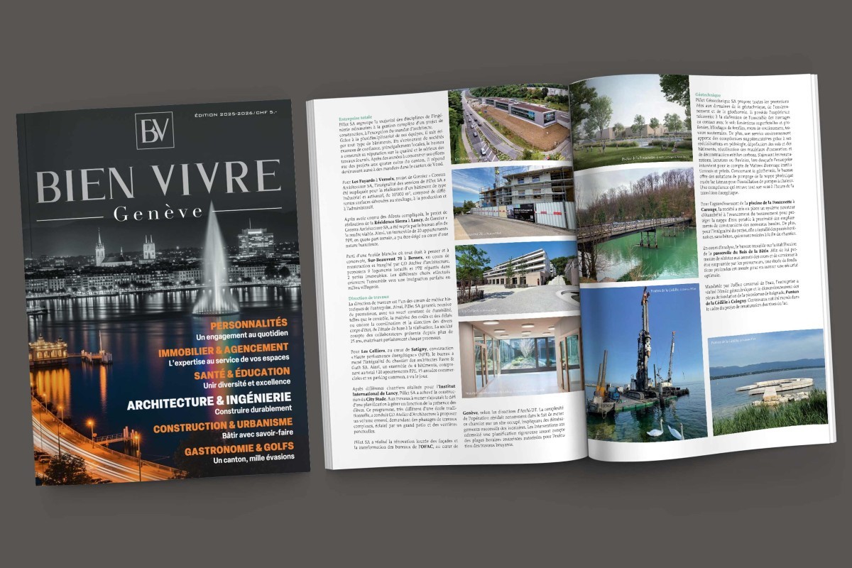 Dans le dernier numéro de Bien Vivre, le Bureau Pillet revient sur plus de trente ans d’expérience au service du développement et de la construction à Genève et dans la région. L’article met en avant la diversité des métiers réunis au sein du bureau : planification générale, direction de travaux, ingénierie civile, géotechnique, chauffage-ventilation ou encore développement immobilier.